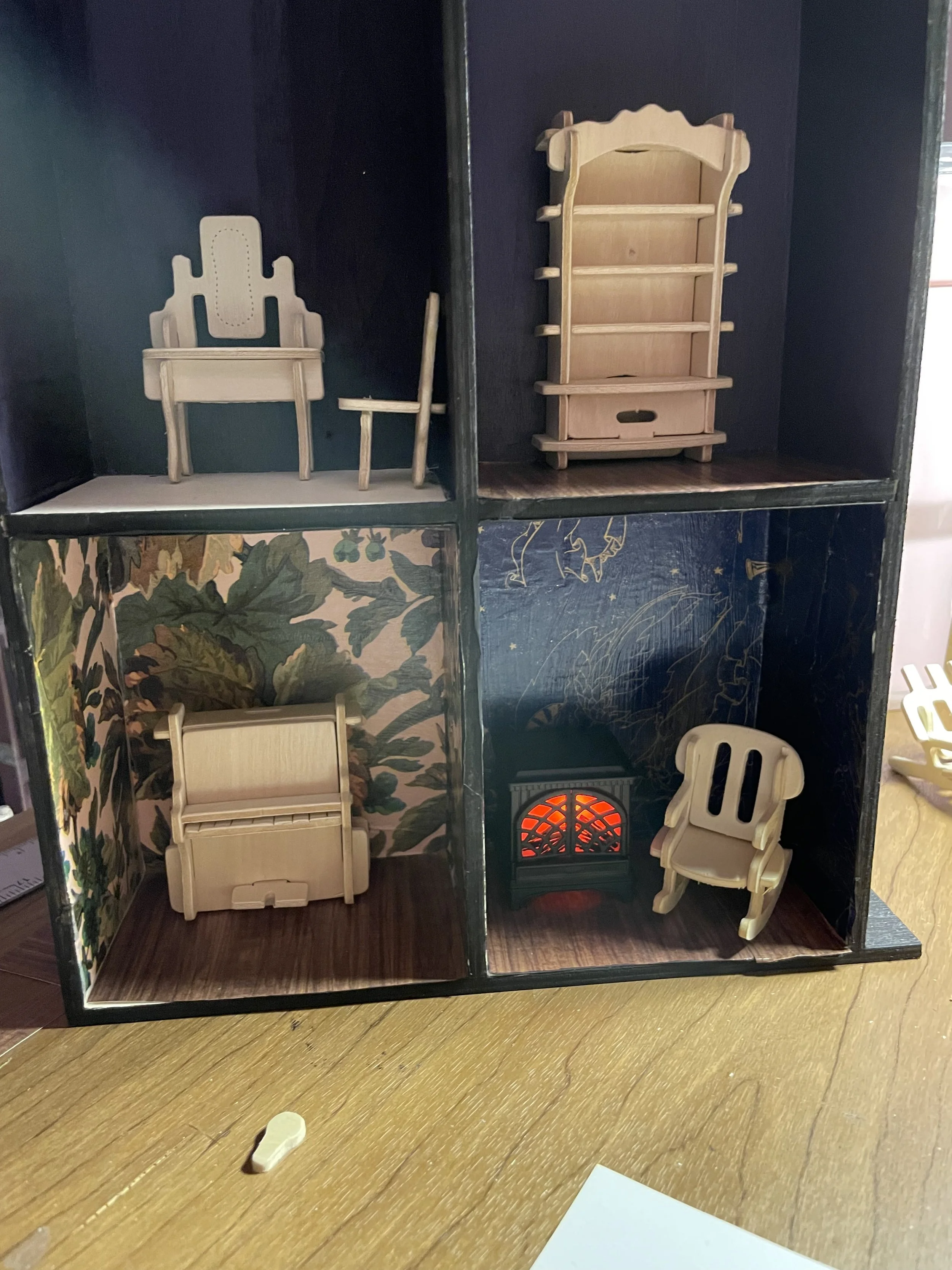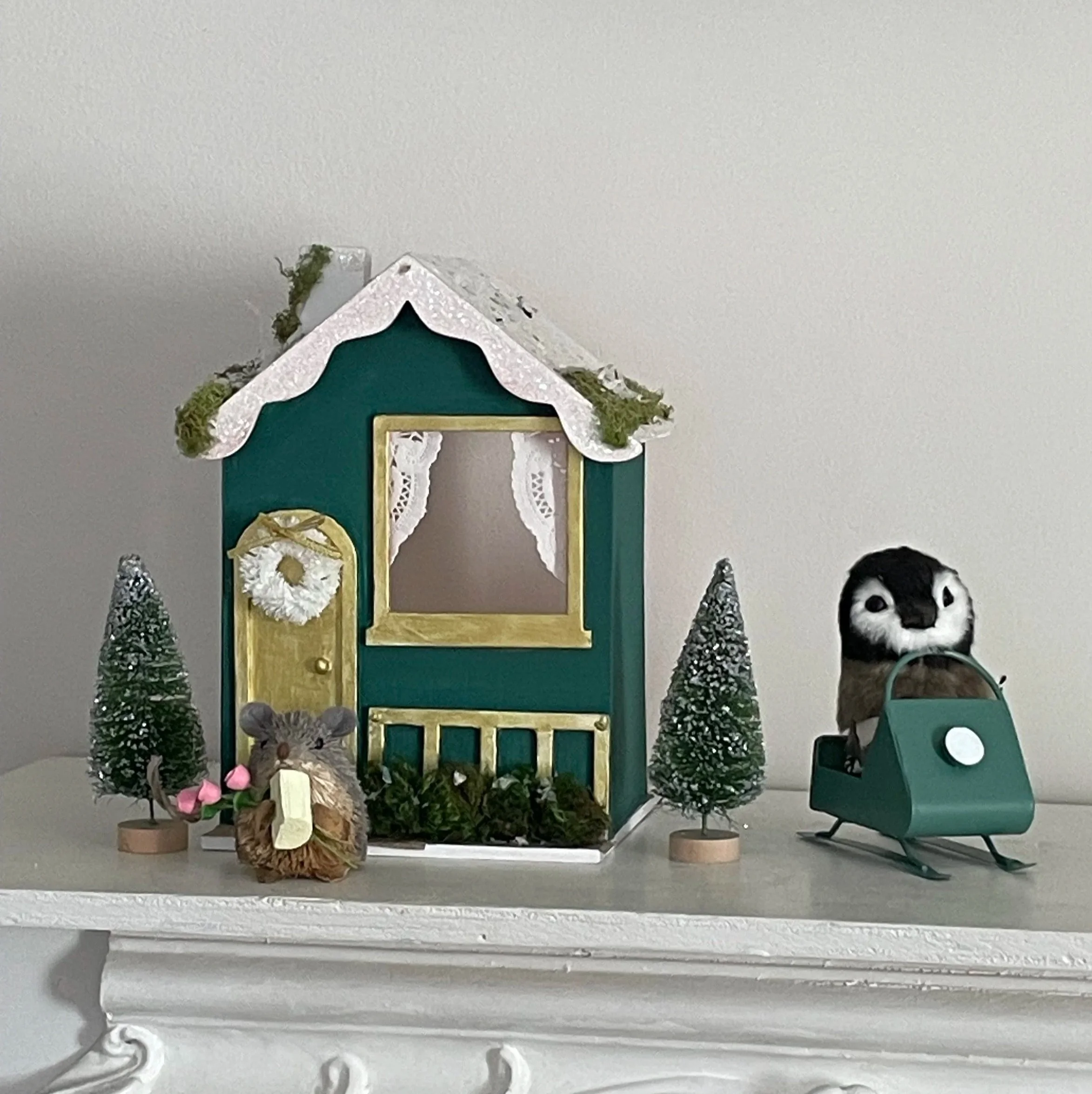 Quentin is the penguin on the right. They move seasonally with Gertrude, the mouse on the left. Each seasonal set up is curated and built by Emma.
